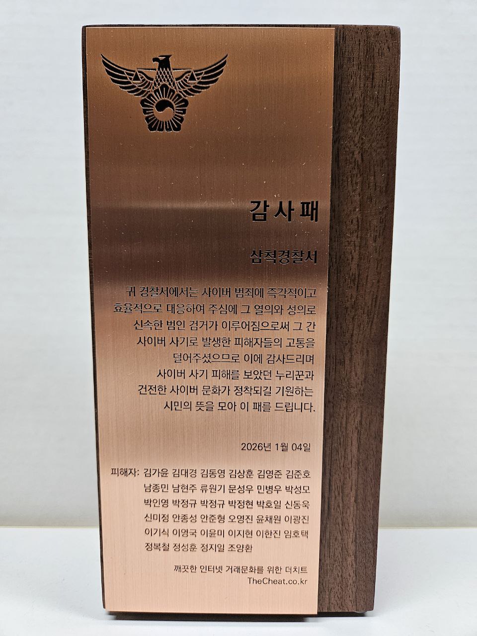 진창민 명의사용 피의자(2025.12)를 검거한 삼척경찰서에 감사패를 전달하고자 합니다.